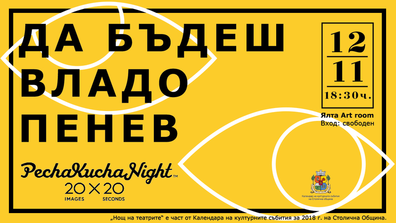 Броени часове преди Нощта на театрите Pecha Kucha Night ще подгрее емоциите и очакването за европейската инициатива. През 2018 г. симпатичният японски формат ще бъде посветен на Владо Пенев. Какво е „Да бъдеш Владо Пенев“ ще разкажат актьорите Дарин Ангелов, Александър Кадиев, Мартина Вачкова, Ованес Торосян и журналистът Димитър Стоянович. Организаторите обещават да ни срещнат с различните лица на темпераментния актьор, пречупени през гледните точни на участниците, а накрая самият Владо Пенев ще разкрие трудно или лесно е да бъдеш Владо Пенев, как съхранява и предизвиква себе си. Домакин на събитието ще е ЯЛТА Клуб, входът е свободен, а началото ще бъде поставено в 18:30 ч. на 12 ноември.