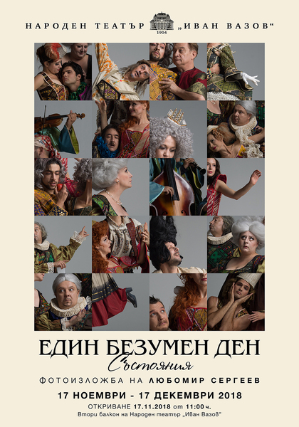 Един от акцентите в празничните театрални дни е откриването на специална изложба, посветена на спектакъла „Един безумен ден“, който имаше премиера в края на септември. Световноизвестният фотограф Любомир Сергеев, който засне уникалния плакат на представлението, ще подреди и покаже избрани моменти от работната фотосесия. Експозицията, наречена „Състояния“, ще бъде открита в събота, 17 ноември, от 11:00 часа, в присъствието на фотографа, режисьора Михаил Петров и актьори от спектакъла. Любомир Сергеев се занимава с професионална фотография повече от 20 години. Носител е на редица отличия, сред които безспорно най-впечатляващата международна награда - Trierenberg Super Circuit , наричан още “Оскар” за фотография. Търсен е от водещи брандове в редица държави, не само в Европа и зад Океана, но дори и в Азия. Освен в България, управлява студио и в Бруклин, Ню Йорк, а всеки негов кадър е шедьовър и завършен спектакъл.